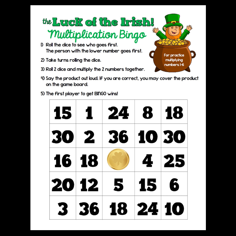Practice multiplication with this Luck of the Irish Multiplication Bingo.
